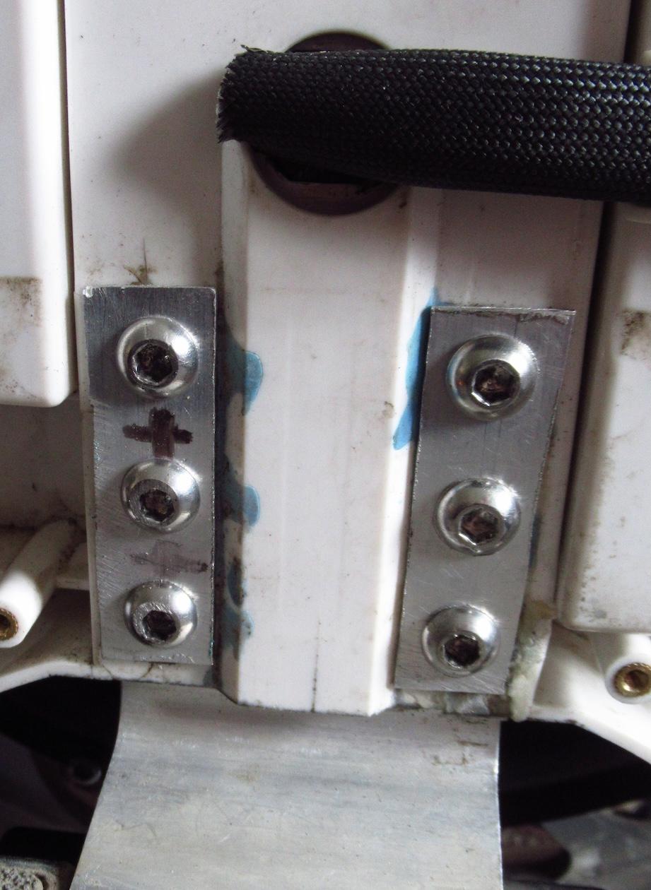 Je fais moi-même plus de 110 kg et je n'ai aucun problème de coque sur ma 18XL, malgré le fait que je l'utilise presque exclusivement sur les pavés parisiens. Par contre je peux dire ce qui est arrivé à la coque sur cette photo : Son plastique ne supporte aucun solvant même celui d'un simple frein-filet bleu sur les vis, il se désagrège à son contact. C'est arrivé sur ma vieille 18L alors j'ai dû y mettre des plaques en alu de répartition des efforts : Je ne recommencerai pas la même erreur sur ma 18XL actuelle.