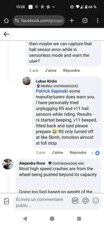 Concernant "la possibilité de rouler sans capteur hall connecté" sur les lynx et modèle d'après ,je ne croit et pense pas que l on doit l'intégrer dans le choix d' une monoroue. Normalement ces capteur ne sont utiles que au démarrage peut être jusqu'à 5 ou 10km/h maxi. J'ai eu l occasion de voir ce qui se passait sur une Sherman og (1ere version,donc dépourvu de ce dispositif), la roue a coupé quand la vitesse était très basse(autour de 5/10 max) puis affiché ERR E-HALL de mémoire .Avant de coupe la roue progressait au dessus de cette vitesse sans aucun signe. Ce qui signifie qu il y a eu un problème pour lire un ou des capteurs hall . De mon avis les roue ne demande aucune information des capteurs hall passé 5/10 km/ h donc la sécurité ajouter sur la lynx serait uniquement : -ne pas tomber à basse vitesse si un problème de lecture de capteur hall survenait Pouvoir rentrer chez soi,sur la roue si un problème de lecture capteur hall survenait. Ce qui est bien mais ça représente très peu de cas dans les problème d' une roue. Rien ne dit que le dispositif fonctionne si un capteur hall se mettrait en court circuit,ou seulement les fils ,ou en étant défectueux enverrai une mauvaise information... Par.la.j entend donc qu a 50km/h une roue qui perd le signal hall ne s arrête pas. Une lynx ou une Begode dont un capteur hall se met en court circuit a 50km/h s arrêtera net certainement . Dans le cas de mon ami avec sa Sherman og,son erreur était a priori le connecteur pas bien branché ou immobilisé,de plus c était une évolution dans un terrain très accidente. D'ailleurs la roue est reparti.quelques minutes après. Mais fatalement, quelques jours plus tard cela a de nouveau était le cas(idem roue s est arrêté a.tres basse vitesse) et cette fois ci la.roue.n est jamais reparti.La panne a été chercher et trouver. -