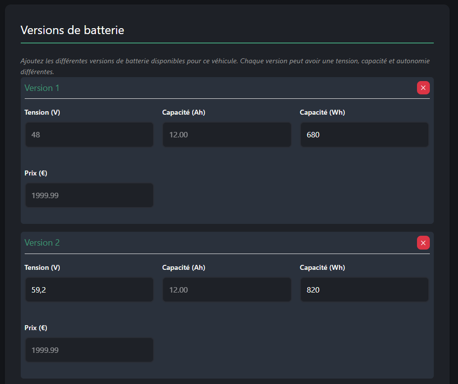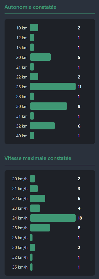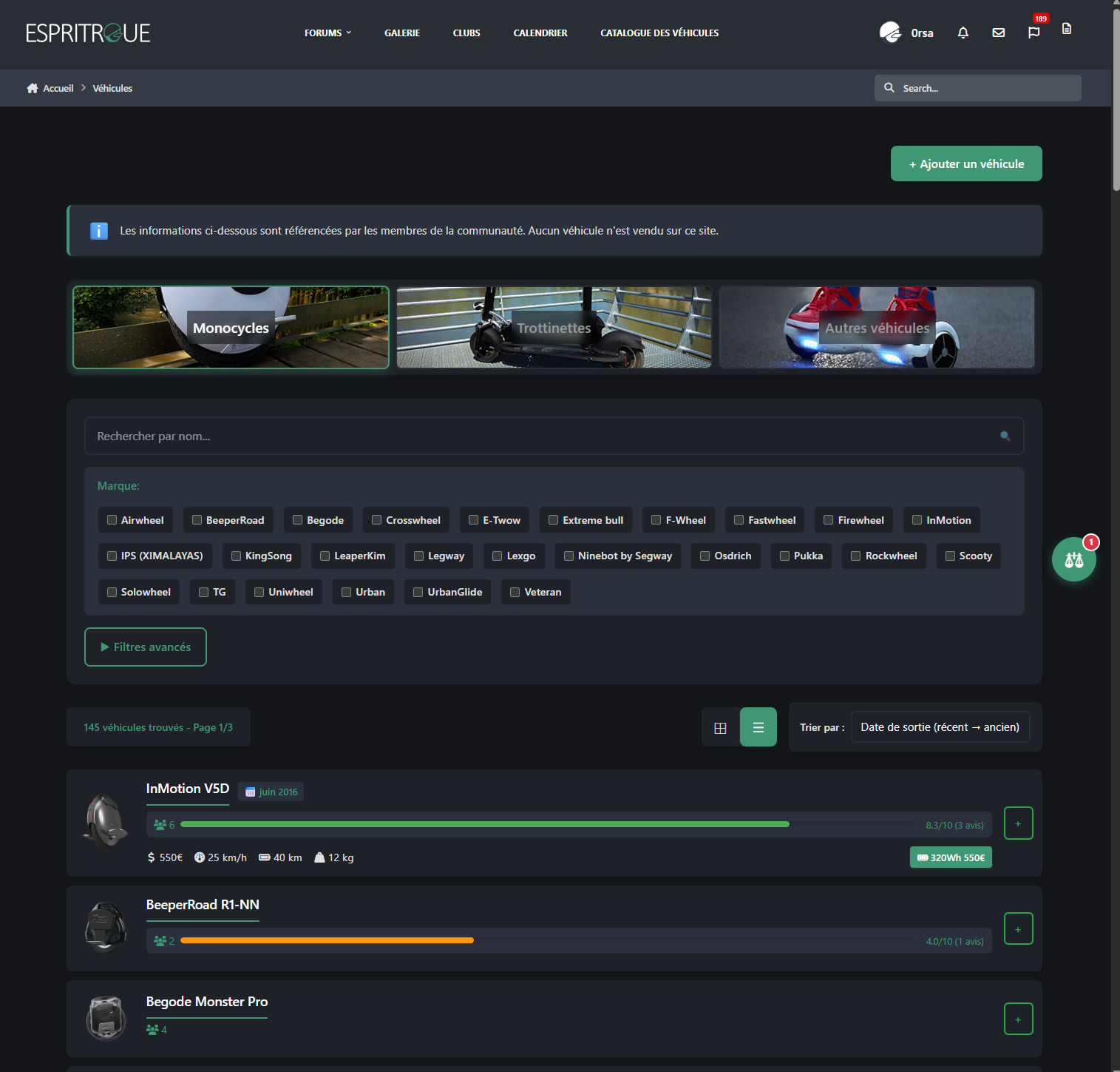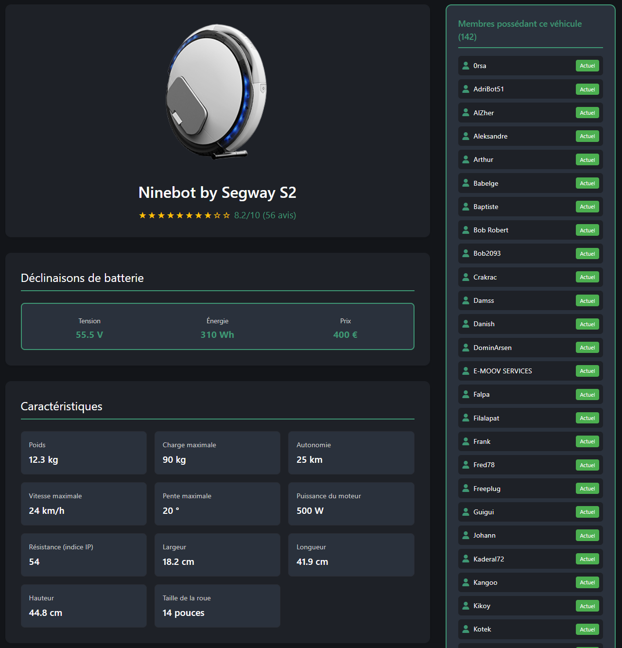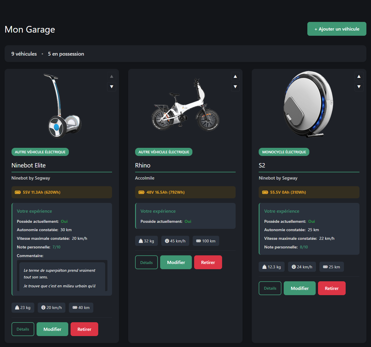 La refonte du module mes engins est terminée et il s'offre une compatibilité thème sombre avec des photos retravaillées pour l'occasion. Les anciens véhicules ont été migrés autant que faire se peut car la gestion des batteries était plus chaotique dans l'ancien système, on a désormais des déclinaisons de batterie pour chaque véhicule bien définies dans la nouvelle version : Il n'y a plus de modération des ajouts et modifications de données pour les membres du forum (un débutant n'est pas un membre) pour fluidifier l'annuaire. Les membres peuvent gérer leur propre flotte de véhicules comme avant en passant par leur compte en haut : Vous pouvez réorganiser l'ordre de vos véhicules (ordre utilisé pour l'affichage dans les posts) avec les flêches en haut à droite de chaque véhicule. L'expérience de chacun permet d'enrichir les statistiques des véhicules au delà des caractéristiques constructeur. Vos véhicules apparaissent comme toujours en dessous de votre signature : Vous pouvez toujours désactiver l'affichage des véhicules dans les posts dans vos informations de profil :