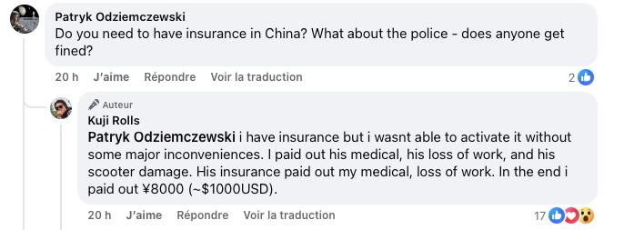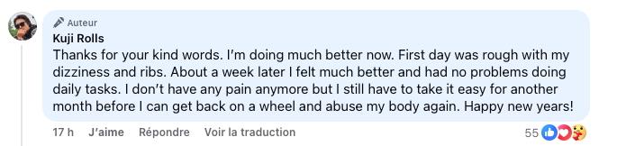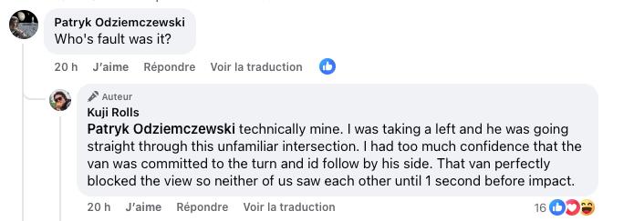 Kuji Rolls... https://www.facebook.com/reel/825633243808025 Ainsi que son récit de l'accident : Soyons tous prudents... EDIT : Quelques renseignements supplémentaires depuis l'évènement : L'impression de la faute : Et les frais d'incapacité :