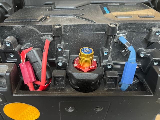 J’était justement en train de démonter ma Patton S aujourd’hui. (Changement d’huile, joints spi SKF et serrage des vis axe moteur) Plus tôt je mentionnais l’absence de joints entre le haut du capot et les boîtiers latéraux: Sur la photo ci dessous on vois bien comment c’est: de l’eau pourrais hypothétiquement s’infiltrer par le haut du capot; puis couler le long du boîtier de la carte mère, et se retrouver dans les petites piscines que forment les deux ouvertures qui contiennent les câbles batterie et leurs connecteurs (bleu et rouge). Les joints au fond de la piscine sont siliconés, mais derrière cette barrière il y a les packs de batteries, on l’on ne veut absolument pas d’eau. Comme de l’eau infiltré dans les piscines pourais y rester le temps de sécher, il faut faire confiance en ces joints. Chose que je ne ferais pas, d’autant plus qu’un joint ça vieilli et se dessèche. De l’eau pourrais aussi entrer par le côté; sous le cache caoutchouc, il y a quelques mm avant les piscines. Alors personne n’a eut de problèmes à ce niveau là, et la SL similaire ment faite à son niveau IP, mais quand même. Tant que possible j’évite que de l’eau puisse aller à ce niveau. Si tu est motivé du silicone tu pourrais en ajouter une bonne couche et te considérer du bon côté pour quelques années.