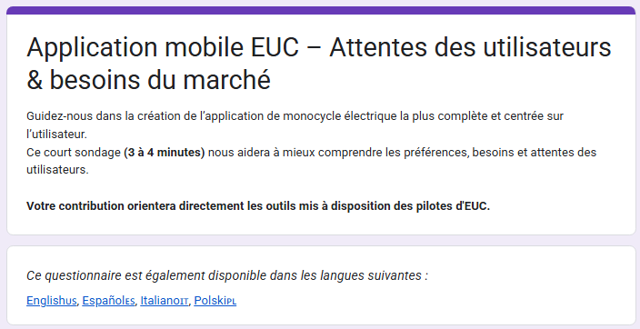 4. Bonjur! Avec quelques amis, nous travaillons sur une nouvelle application EUC complète 📲 (une alternative aux applications non officielles actuelles). Pour bien faire les choses, nous recherchons des retours de vrais utilisateurs, donc je partage un court sondage. Il dure environ 3–4 minutes, il est anonyme, et vos réponses ainsi que vos suggestions nous aideront à créer les fonctionnalités que vous avez réellement envie d’utiliser. Lien : https://forms.gle/XJnmcQu5F6J3njYN6 Merci à tous ceux qui participeront - nous apprécions vraiment votre aide!