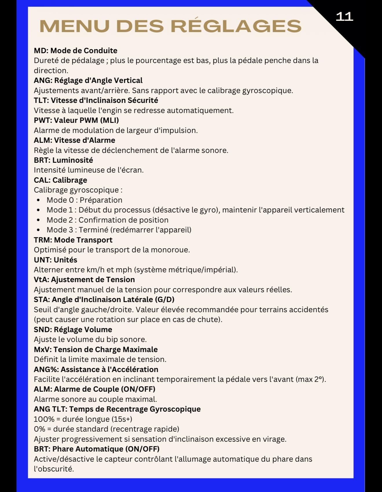 9. C'est ça ! Manuel anglais > PWT = PWM Tiltback Alarm - Speed at which the unit tilts back. Highest value turns off tilt-back. Manuel français > PWT = Valeur PWM (MLI) Alarme de modulation de largeur d'impulsion (à tes souhaits !) Par contre l'app Nosfet ne sert qu'aux mises à jour et à surveiller le BMS. Tous les réglages se font soit sur la wheel, soit via une app tierce.
