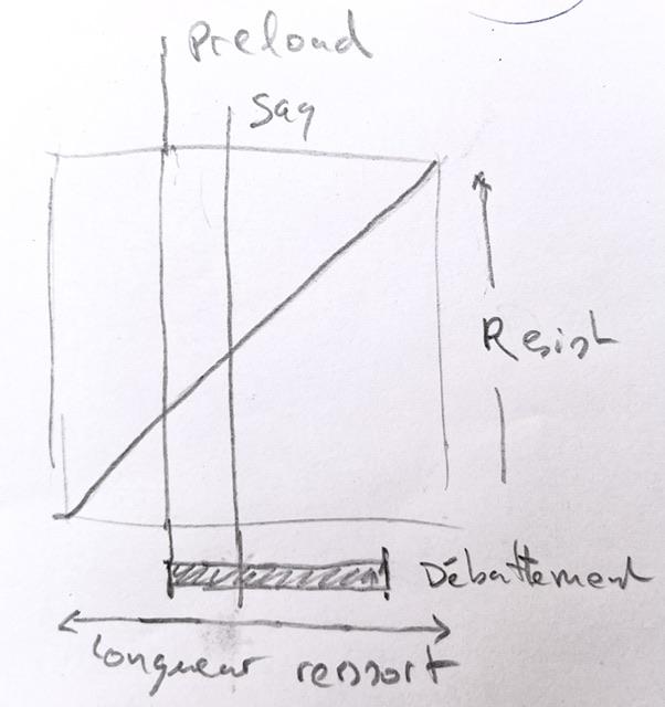 Un petit schéma pour réfléchir: La précontrainte raccourcis la longueur du ressort, et fait un offset de la position 0 de la suspension. La longueur de débattement de la suspension (rectangle gris) se déplace sur la longueur du ressort (et son niveau de résistance) par l’action de la précontrainte. Ils sont liés. Le sag entame le débattement, selon le poids appliqué et la résistance offerte par le ressort, dans la plage du ressort où se trouve la plage de débattement. La même force qui fait le sag, amplifiée par l’inertie lors des mouvements, continuera d’écraser le ressort et avancer sur la plage de débattement; jusqu’à talonner si le ressort n’offre pas suffisamment de résistance. Comme je le comprends, la précontrainte fait avancer la plage de débattement sur la progression de résistance du ressort. La résistance offerte évolue donc avec la précontrainte.