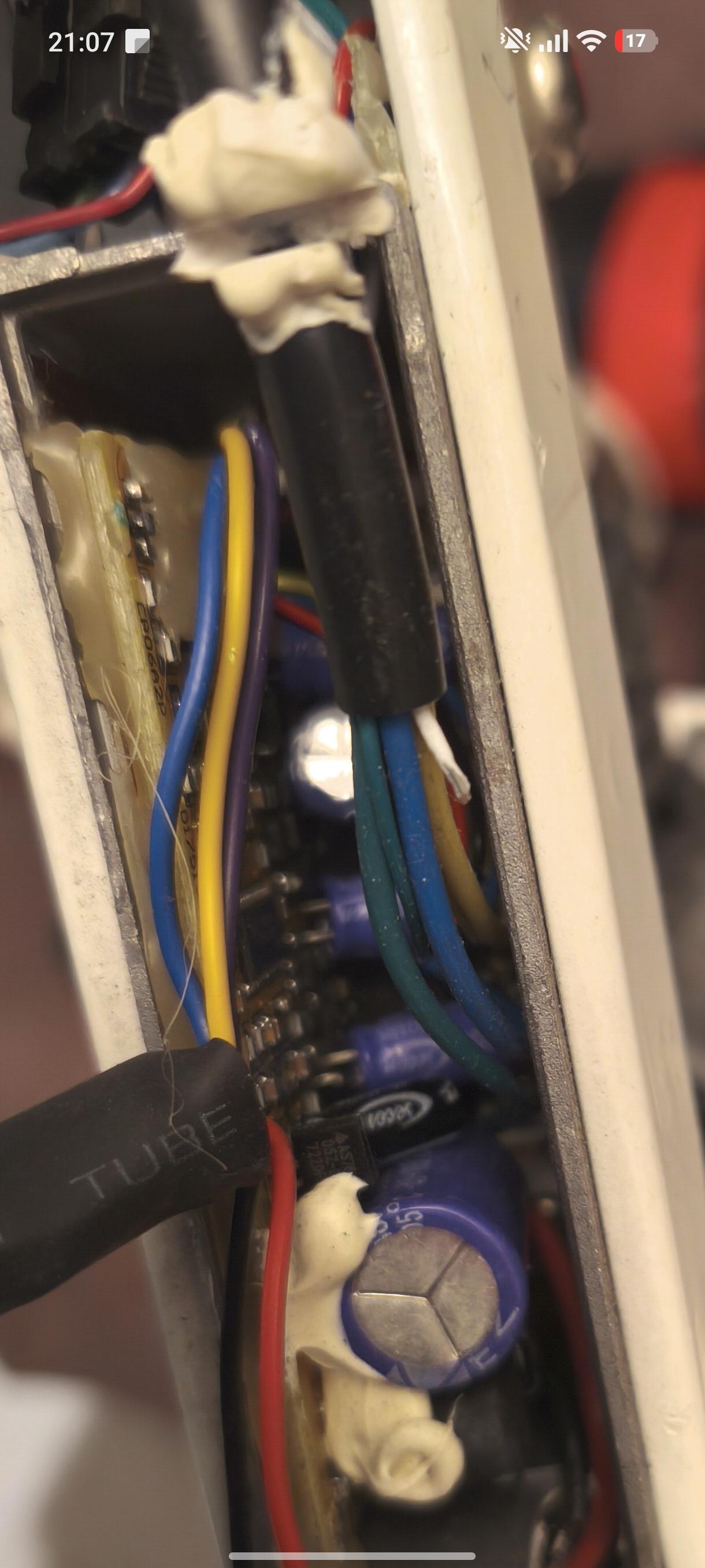 2. Bonjour, On m'a donné une trotinette électrique qui est en panne elle ne démarre pas la baterie semble se charger, en démontant le cache en bas où y a le trou pour la charge j'ai remarqué qu'il a été démonté auparavant car il y avait une vis qui manquait j'ai aussi remarque qu'il y a un fil mince blanc coupe d'apres l'image que je vous ai fournit. Est ce que ça serait possible de démonter le cache de votre trotinette électrique et de m'envoyer une photo pour que je vois où est soudé le fil blanc.