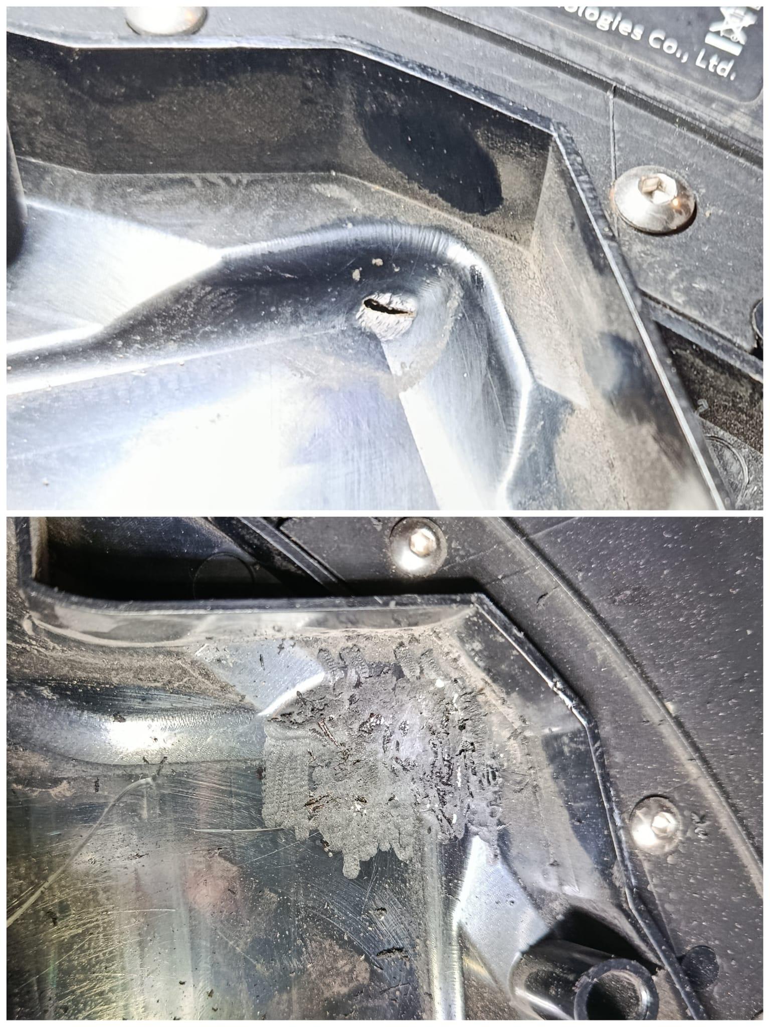 Concernant les petits trous et fissures: Quand en 22k kms le pneu rogne la coque par l'intérieur: consolidation à la toile, apport d'ABS et meulage sur les 4 coins. La fixation d'amortisseur en point bas, sur les deux coques, ajout de métal lissage... Bon j'ai pas fait de photos sur les demies coques extérieurs mais vous imaginez maintenant.